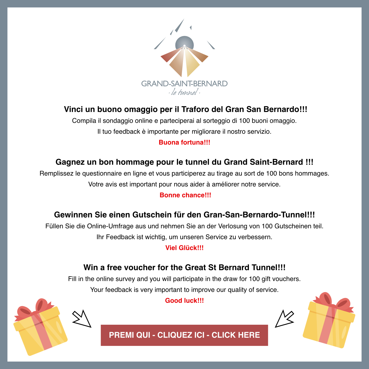 PROMOZIONE RITORNO GRATUITO Le seguenti manifestazioni danno diritto al ritorno gratuito al Tunnel del Gran-San-Bernardo. Su presentazione del biglietto « corsa